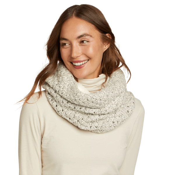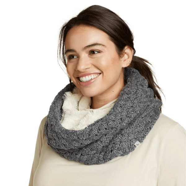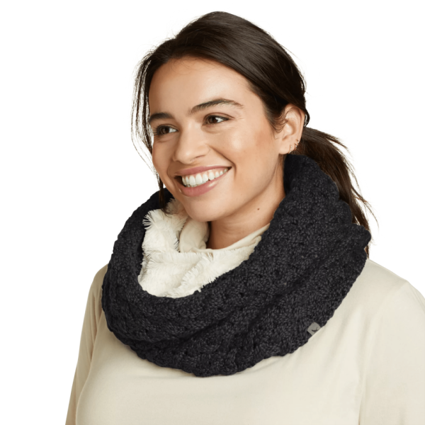 Lined with cozy polyester fleece, this chunky-knit cotton/polyester cowl scarf adds rich texture and welcome warmth on chilly days. Neutral coloring coordinates easily.