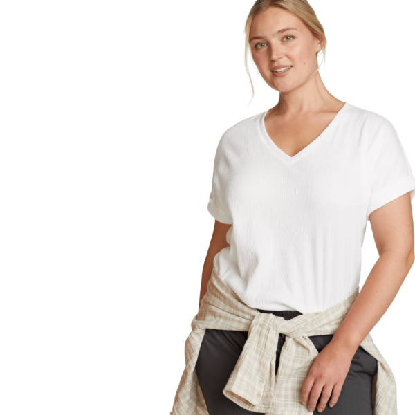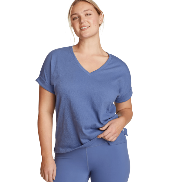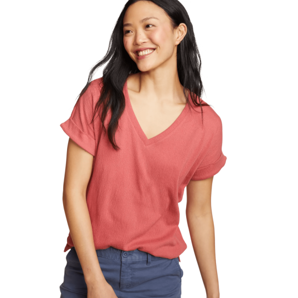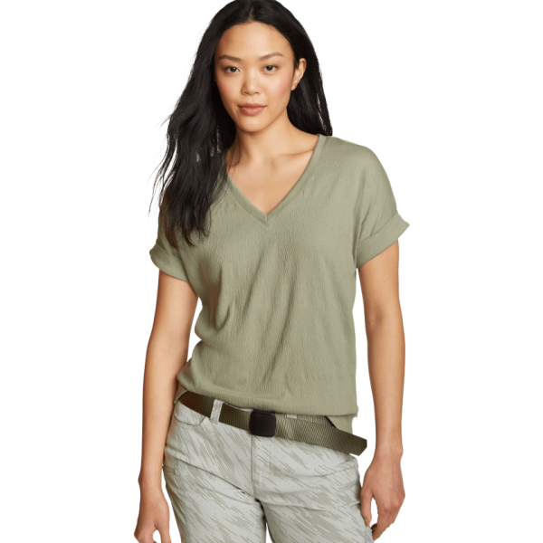 Our Thistle Textured V-Neck T-Shirt combines lightweight, crinkled fabric with rolled short sleeves and a V-neckline, creating the perfect blend of style and comfort for everyday wear.